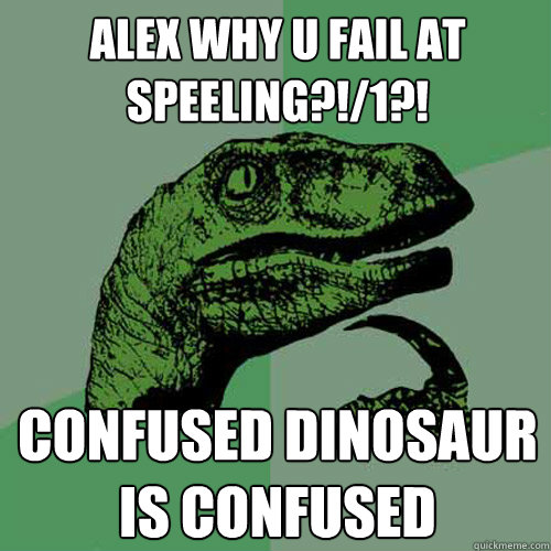 Alex why u fail at speeling?!/1?! Confused dinosaur is confused
