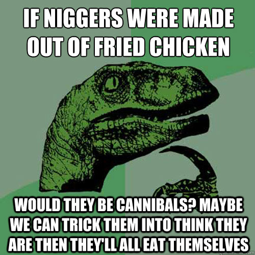 if niggers were made out of fried chicken would they be cannibals? Maybe we can trick them into think they are then they'll all eat themselves