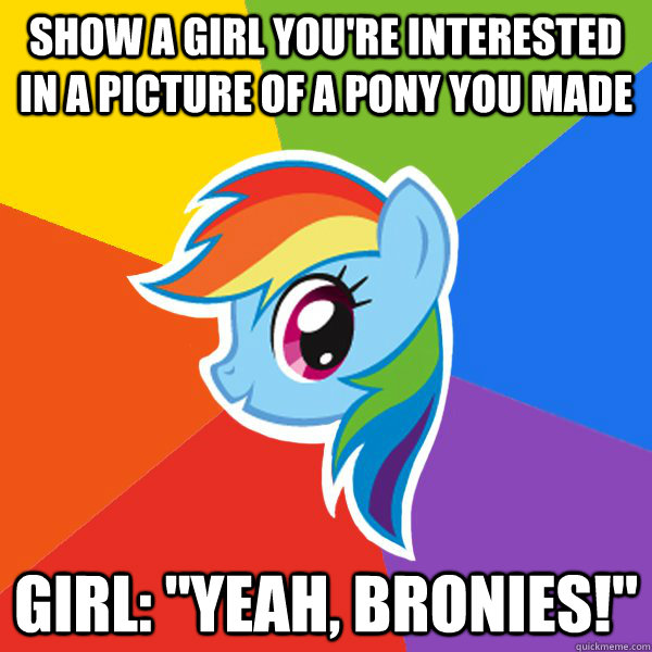 Show a girl you're interested in a picture of a pony you made Girl: "Yeah, bronies!"