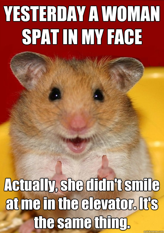 YESTERDAY A WOMAN SPAT IN MY FACE Actually, she didn't smile at me in the elevator. It's the same thing.
