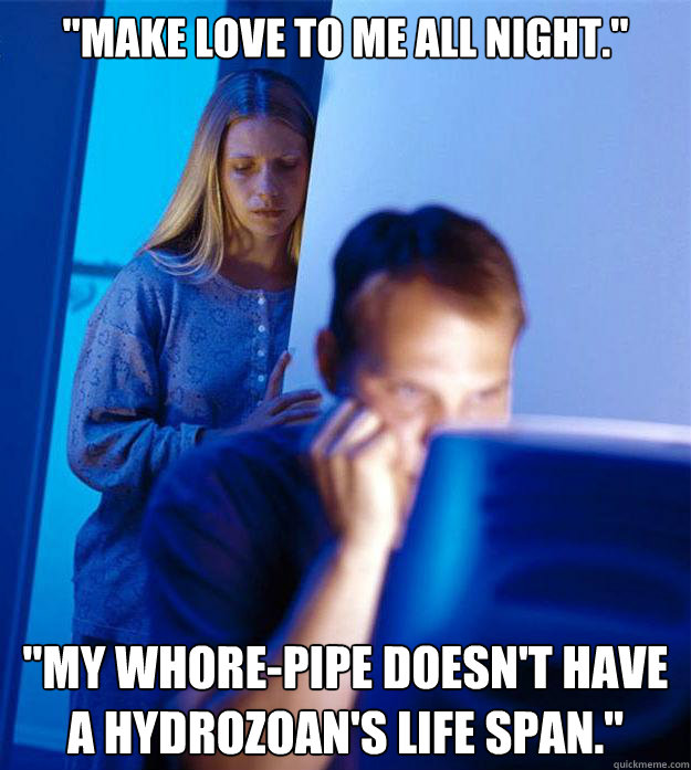"make love to me all night." "My Whore-Pipe doesn't have a hydrozoan's life span."