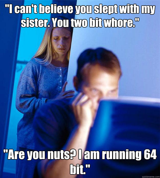 "I can't believe you slept with my sister. You two bit whore." "Are you nuts? I am running 64 bit."