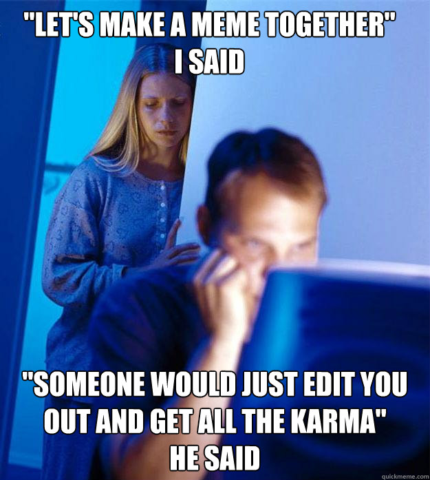"Let's make a meme together" I said "Someone would just edit you out and get all the Karma" He said