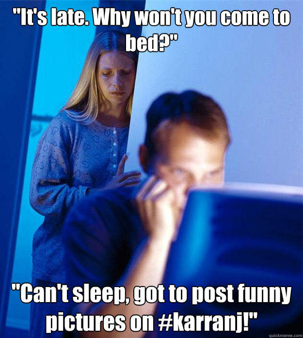 "It's late. Why won't you come to bed?" "Can't sleep, got to post funny pictures on #karranj!"