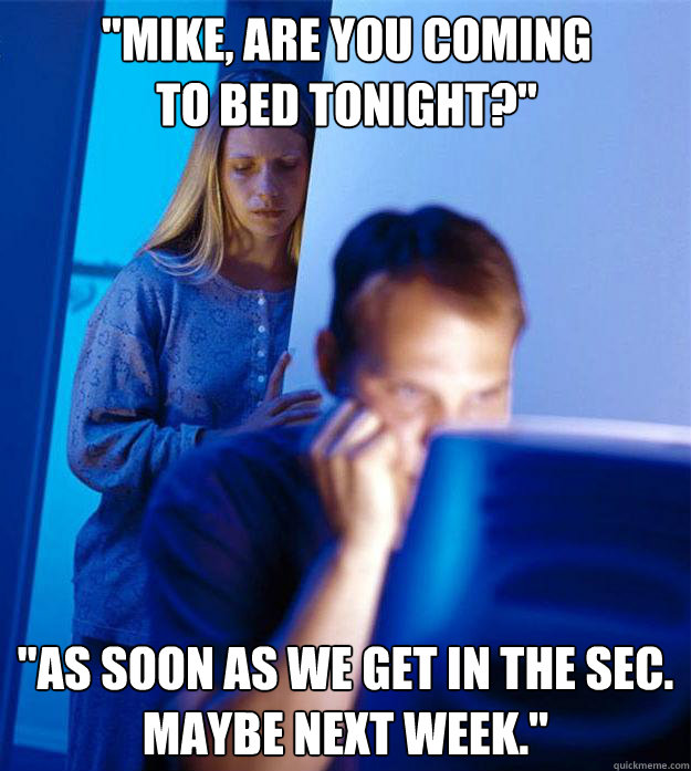 "Mike, are you coming to bed tonight?" "As soon as we get in the SEC. Maybe next week."