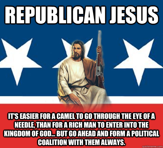 Republican Jesus It's easier for a camel to go through the eye of a needle, than for a rich man to enter into the kingdom of God... but go ahead and form a political coalition with them always.