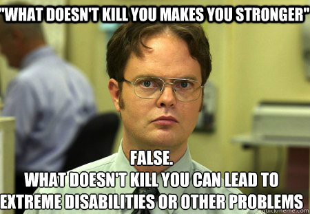 "What doesn't kill you makes you stronger" False. What doesn't kill you can lead to extreme disabilities or other problems