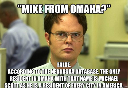 "Mike from Omaha?" False. According to the Nebraska database, the only resident in Omaha with that name is Michael Scott as he is a resident of every city in America.