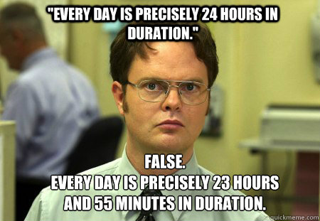 "Every day is precisely 24 Hours in duration." False. Every day is precisely 23 hours and 55 minutes in duration.