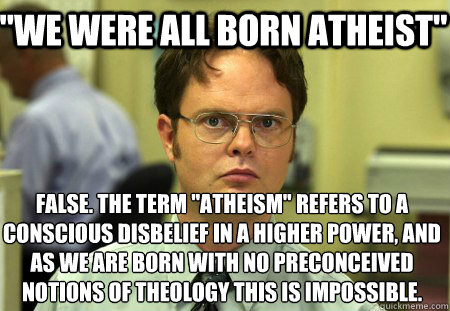 "We were all born atheist" False. The term "Atheism" refers to a conscious disbelief in a higher power, and as we are born with no preconceived notions of theology this is impossible.