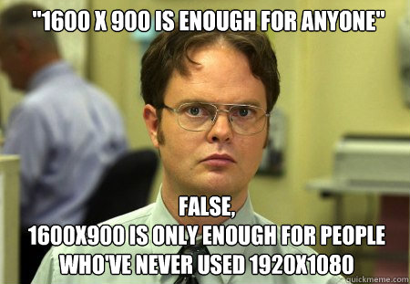 "1600 x 900 is enough for anyone" FALSE, 1600x900 is only enough for people who've never used 1920x1080