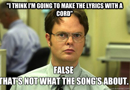 "I think I'm going to make the lyrics with a cord" FALSE That's not what the song's about.