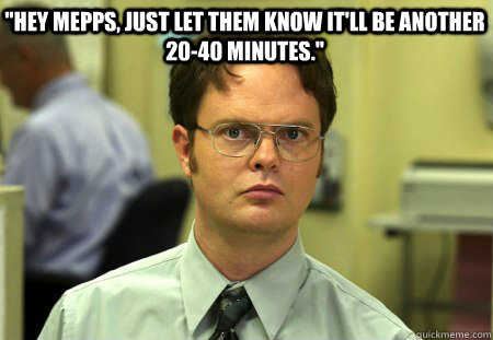 "Hey Mepps, just let them know it'll be another 20-40 minutes."