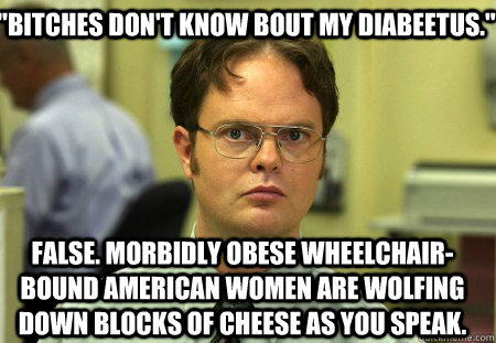 "Bitches Don't Know Bout My Diabeetus." False. Morbidly obese wheelchair- bound American women are wolfing down blocks of cheese as you speak.