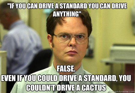 "If you can drive a standard you can drive anything" False. Even if you could drive a standard, you couldn't drive a cactus