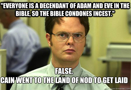 "Everyone is a decendant of adam and eve in the bible, so the bible condones incest." False. Cain went to the land of nod to get laid