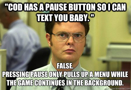"COD has a pause button so I can text you baby. " False. Pressing pause only pulls up a menu while the game continues in the background.