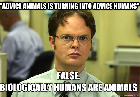 "advice animals is turning into advice humans" FALSE. BIOLOGICALLY HUMANS ARE ANIMALS