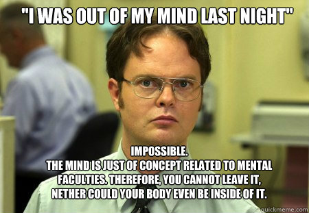 "I was out of my mind last night" IMPOSSIBLE. The mind is just of concept related to mental faculties. Therefore, you cannot leave it, nether could your body even be inside of it.
