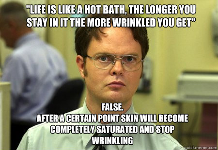 "life is like a hot bath, the longer you stay in it the more wrinkled you get" False. after a certain point skin will become completely saturated and stop wrinkling