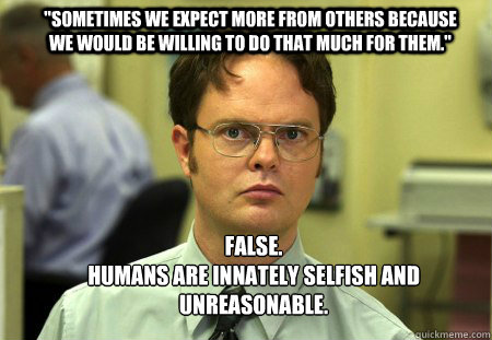 "Sometimes we expect more from others because we would be willing to do that much for them." FALSE. Humans are innately selfish and unreasonable.