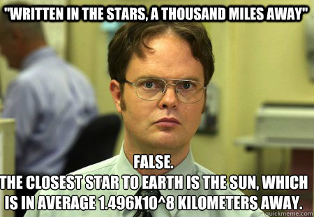 "Written in the stars, a thousand miles away" False. The closest star to Earth is the Sun, which is in average 1.496x10^8 kilometers away.