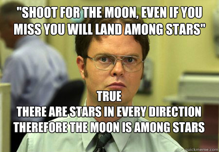 "Shoot for the moon, even if you miss you will land among stars" True There are stars in every direction therefore the moon is among stars