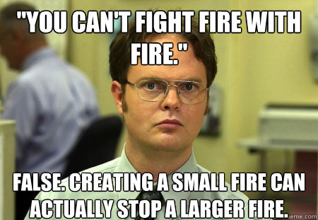"You can't fight fire with fire." False. Creating a small fire can actually stop a larger fire.