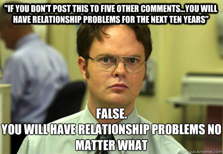 "If you don't post this to five other comments...you will have relationship problems for the next ten years" False. you will have relationship problems no matter what