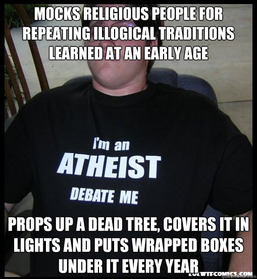 mocks religious people for repeating illogical traditions learned at an early age props up a dead tree, covers it in lights and puts wrapped boxes under it every year