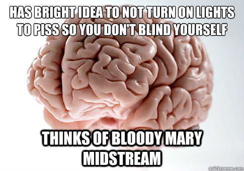 Has bright idea to not turn on lights to piss so you don't blind yourself Thinks of bloody Mary midstream