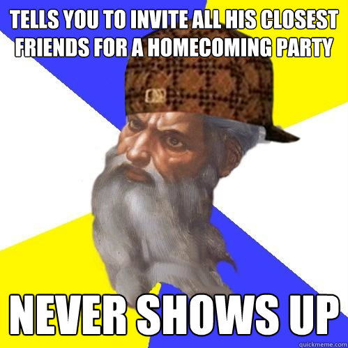 Tells you to invite all his closest friends for a homecoming party Never shows up