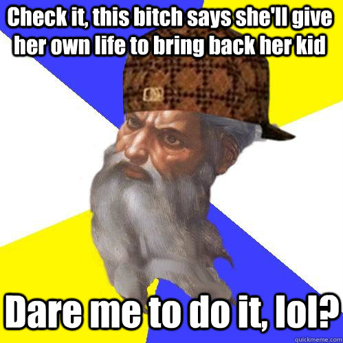 Check it, this bitch says she'll give her own life to bring back her kid Dare me to do it, lol?