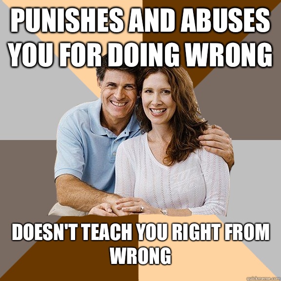 Punishes and abuses you for doing wrong Doesn't teach you right from wrong