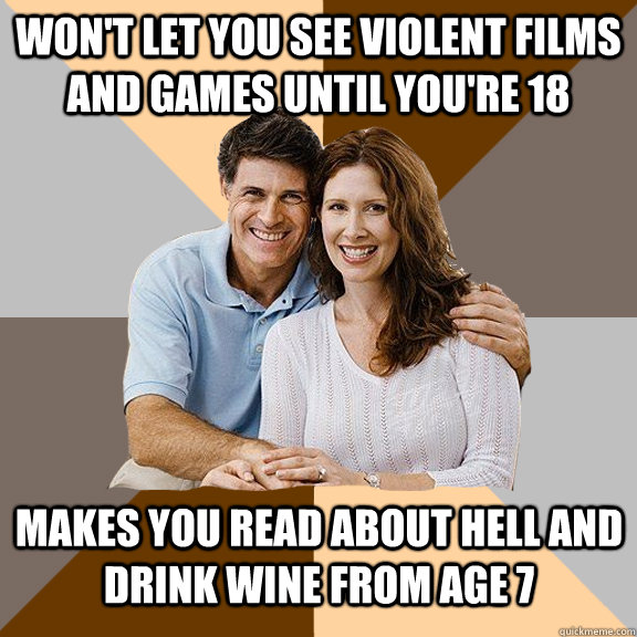Won't let you see violent films and games until you're 18 Makes you read about hell and drink wine from age 7