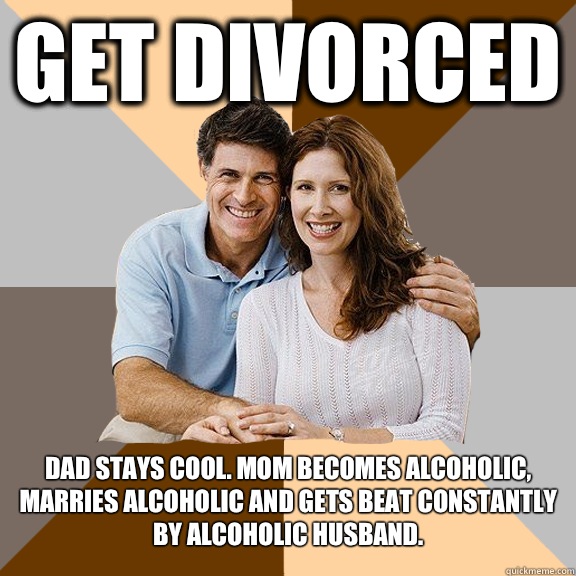 Get divorced Dad stays cool. Mom becomes alcoholic, marries alcoholic and gets beat constantly by alcoholic husband.