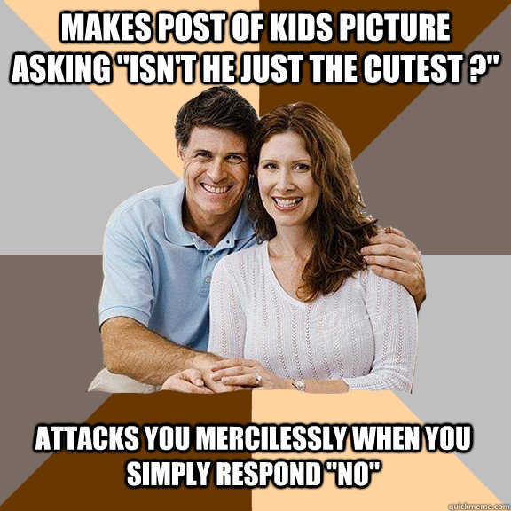 Makes post of kids picture asking "Isn't he just the cutest ?" Attacks you mercilessly when you simply respond "no"