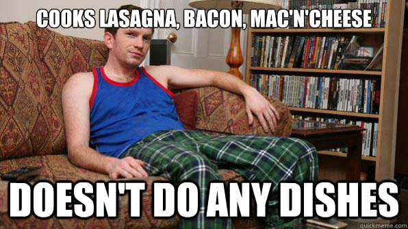 COOKS lasagna, bacon, mac'n'cheese doesn't do any dishes