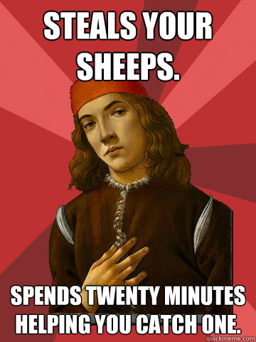 Steals your sheeps. Spends twenty minutes helping you catch one.