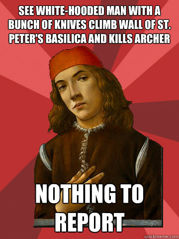 see white-hooded man with a bunch of knives climb wall of st. peter's basilica and kills archer NOTHING TO REPORT