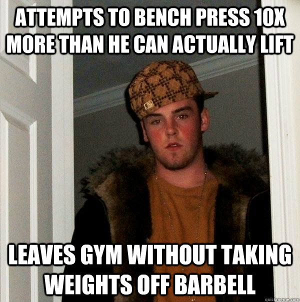 attempts to bench press 10X more than he can actually lift leaves gym without taking weights off barbell