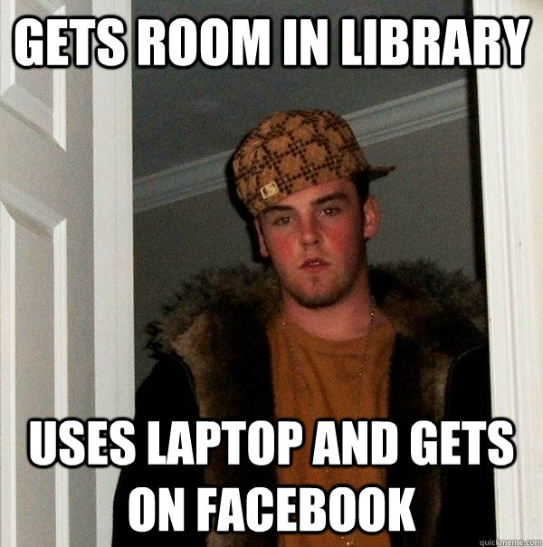 Gets room in library uses laptop and gets on facebook