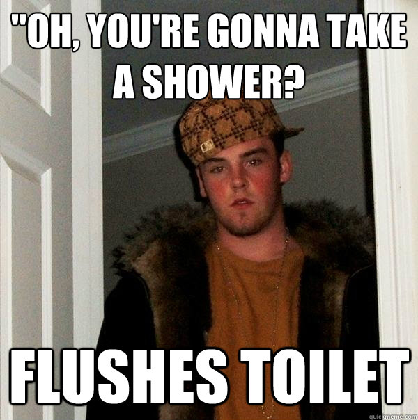 "Oh, you're gonna take a shower? Flushes Toilet