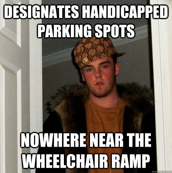 Designates handicapped parking spots Nowhere near the wheelchair ramp