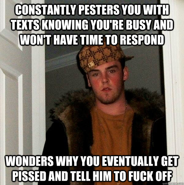 constantly pesters you with texts knowing you're busy and won't have time to respond wonders why you eventually get pissed and tell him to fuck off