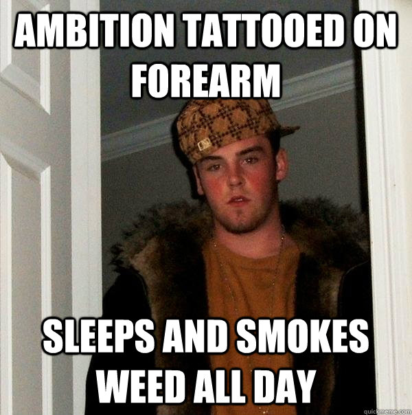 Ambition tattooed on forearm sleeps and smokes weed all day