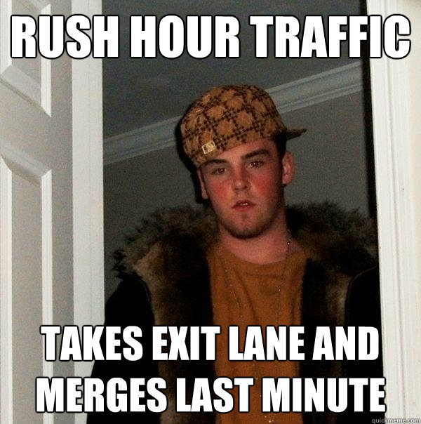 RUSH HOUR TRAFFIC takes exit lane and merges last minute