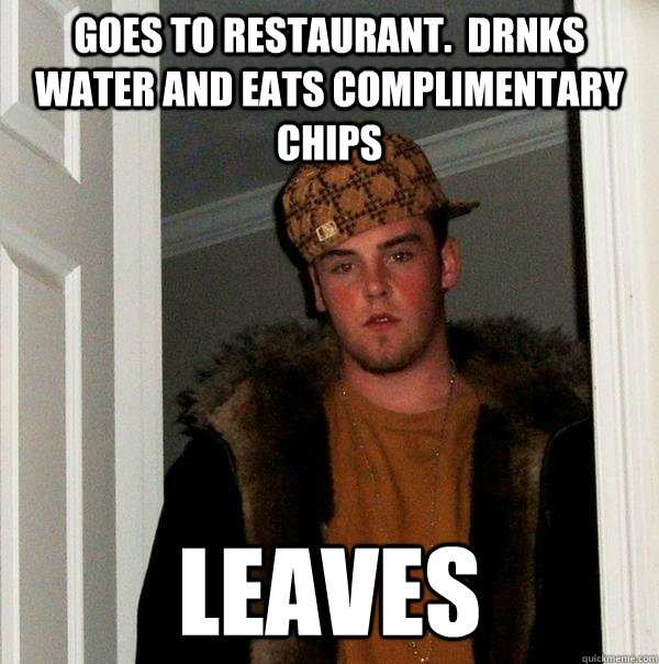 goes to restaurant. drnks water and eats complimentary chips leaves