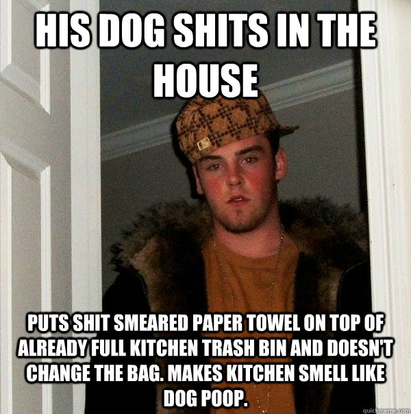 His dog shits in the house Puts shit smeared paper towel on top of already full kitchen trash bin and doesn't change the bag. Makes kitchen smell like dog poop.