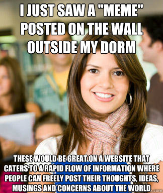 I just saw a "meme" posted on the wall outside my dorm These would be great on a website that caters to a rapid flow of information where people can freely post their thoughts, ideas, musings and concerns about the world